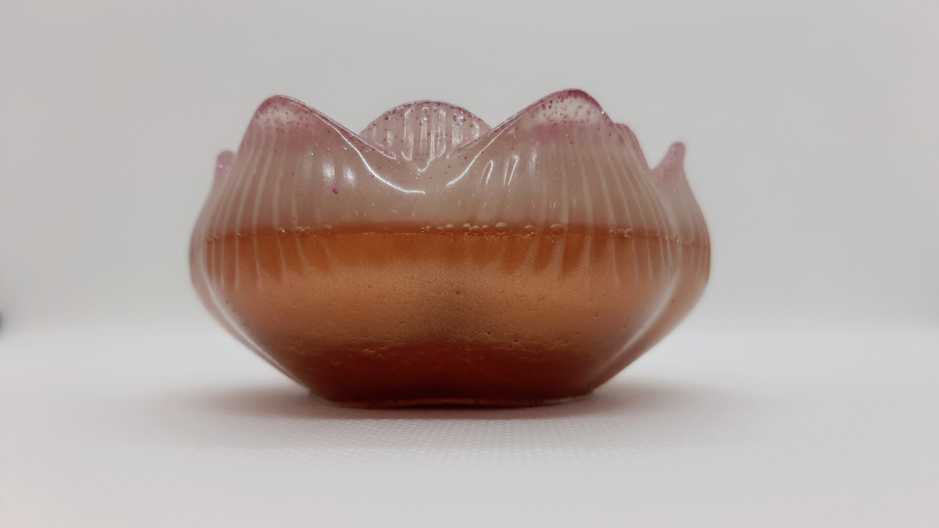 Teelichthalter in Form einer Lotusblumen-Schale. Transparent, Boden kupferfarbiger Glitter, weiße Spitzen mit feinen rosa Glitter. Höhe ca 4 cm, Durchmesser ca 8 cm.
