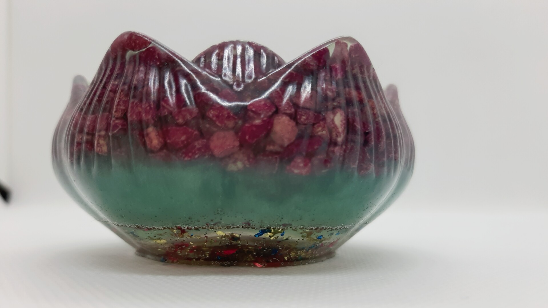 Teelichthalter in Form einer Lotusblumen-Schale. Transparent, Boden farbiger Glitter, Mitte grün und die Spitzen mit feinen lila Kiesel gefüllt. Höhe ca 4 cm, Durchmesser ca 8 cm.