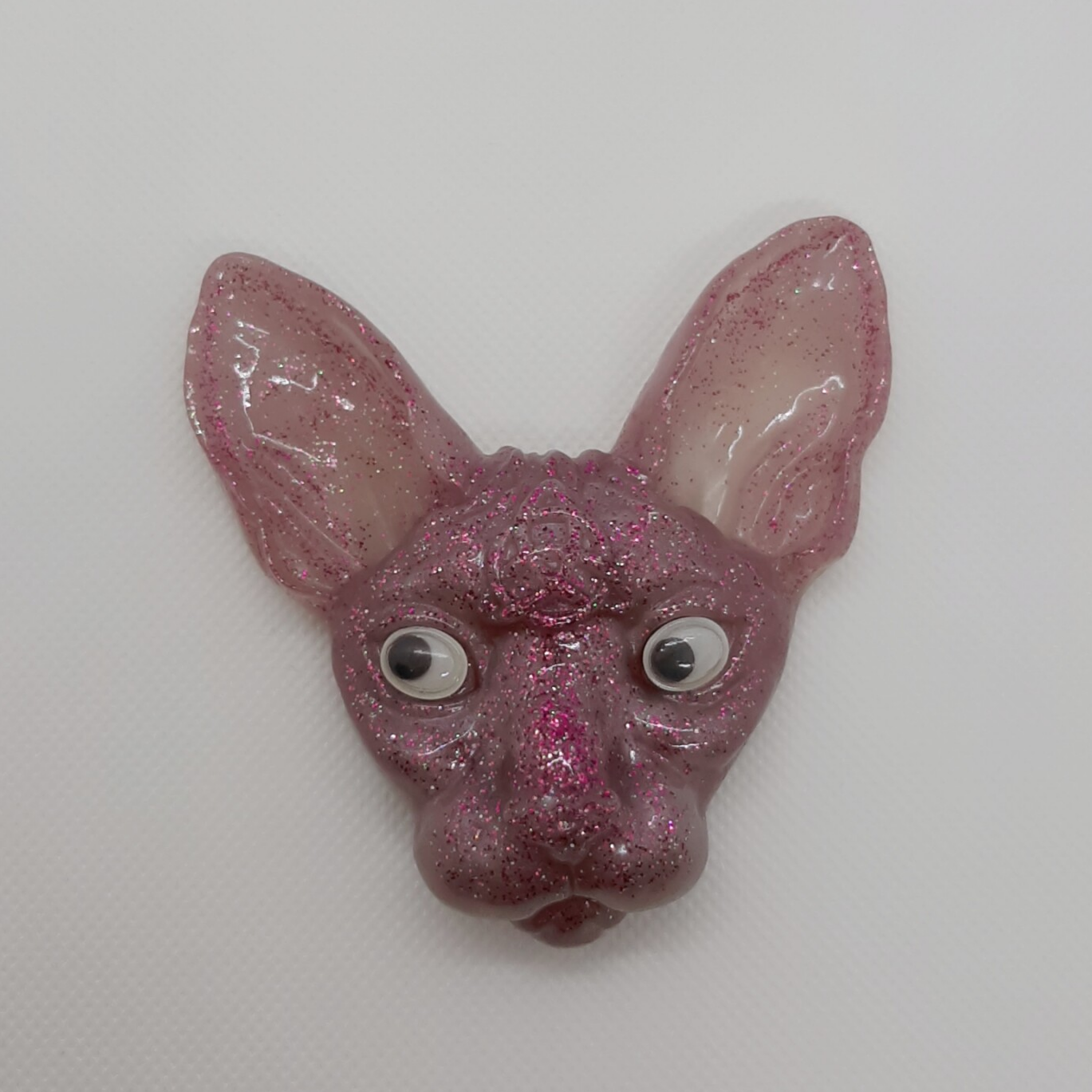 Katzenkopf mit großen Ohren, transparent mit feinen, lila Glitter und Augen. Größe ca 8 cm x 9 cm.