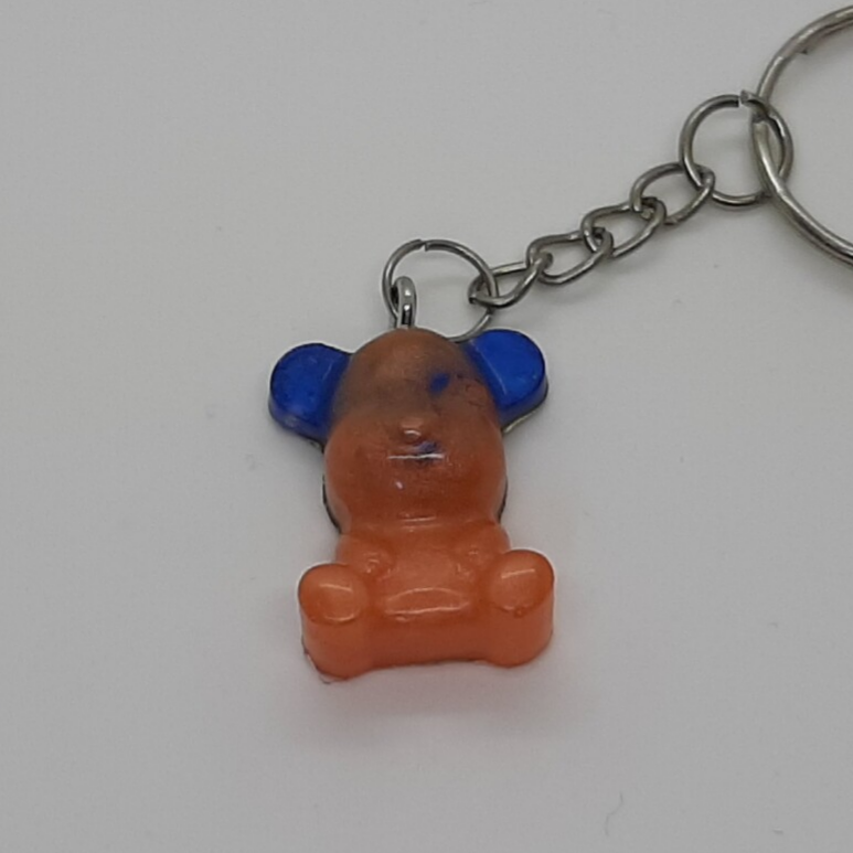 Ein Schlüsselanhänger als oranger Teddybär mit blauen Ohren. Größe ca 2 cm x 2 cm.