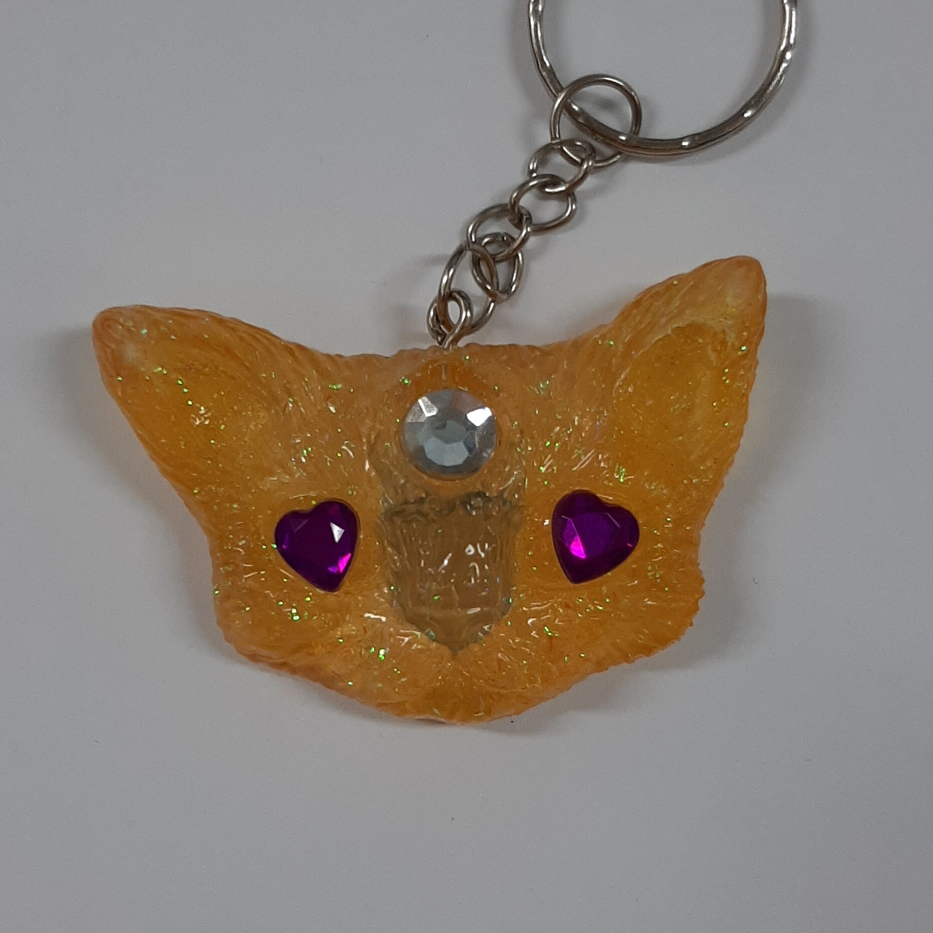 Schlüsselanhänger Katze. Transparent/gelbe Katze, mit lila Herzchen als Augen und einen Diamanten als drittes Auge und mit wenig leuchtend grünen Glitter. Größe ca 6 cm x 5 cm.