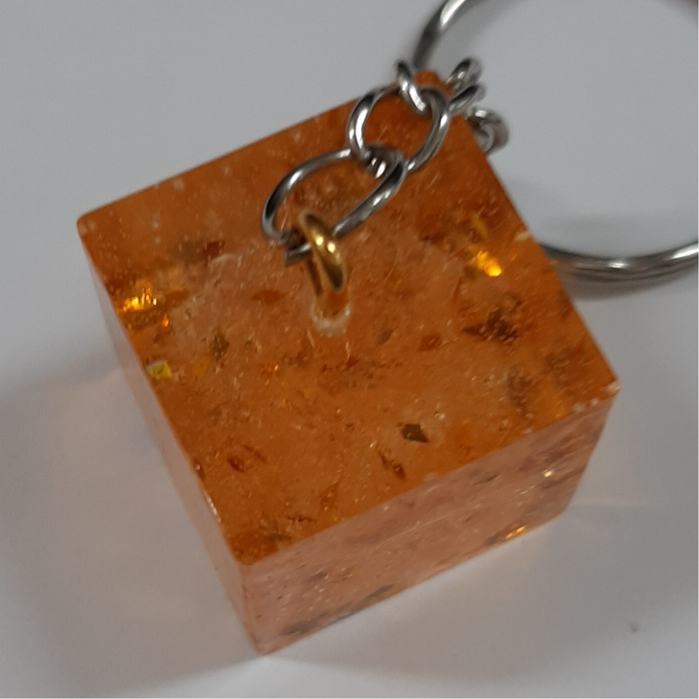 Schlüsselanhänger als Würfel. Transparent und im Inneren ist ein kleiner Zuckerdonut und am Boden sind kleine, bunte Sternchen. Größe ca 2 cm x 2 cm x 2 cm.