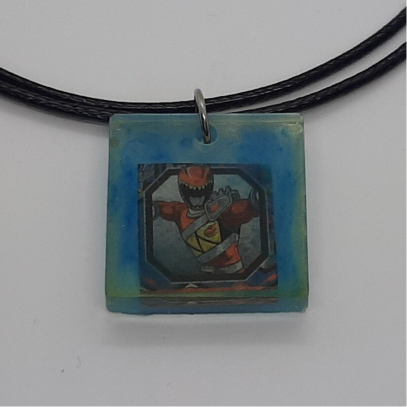 Lederhalsband mit quadratischen Anhänger. Anhänger ist transparent mit hellblauen Hintergrund und einen Powerranger im Inneren. Grösse ca 2,5 cm x 2,5 cm. Bandumfang ca 46 cm.
