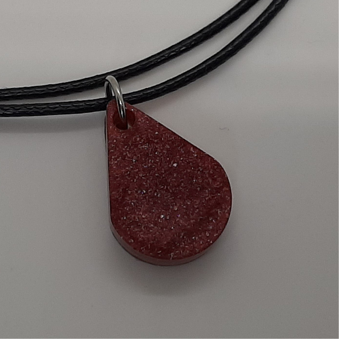 Lederhalsband mit oval/spitzen Anhänger. Anhänger ist weinrot und mit feinen Glitter gefüllt. Durchmesser ca 2 cm. Bandumfang ca 46 cm.